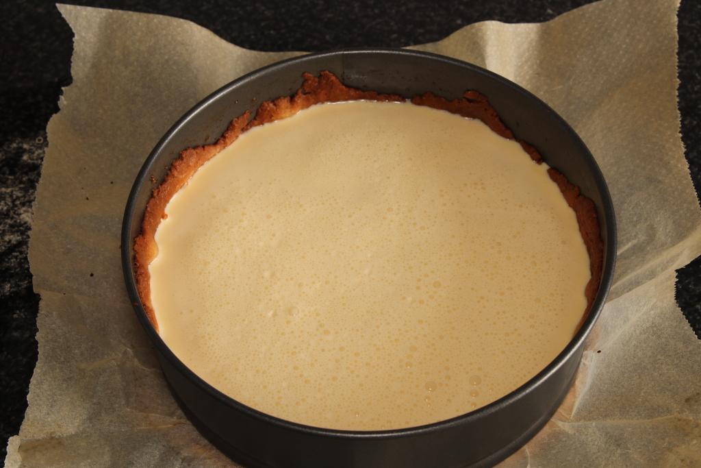 Mientras preparamos el relleno, en un bol amplio vertemos la nata (crema de leche), el queso ricotta, el azúcar, los huevos y el queso azul. Batimos con la batidora hasta que quede una crema homogénea. Sacamos el molde del horno, retiramos el papel y los garbanzos (no importa que quede un poco cruda en la base, terminará de hacerse en el horno), añadimos el relleno, volvemos a hornear a 180ºC, durante otros 15 minutos, hasta quede semicuajada.
