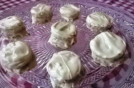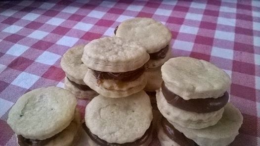 e hice unos alfajores rellenos de dulce de leche y cubiertos con chocolate blanco..