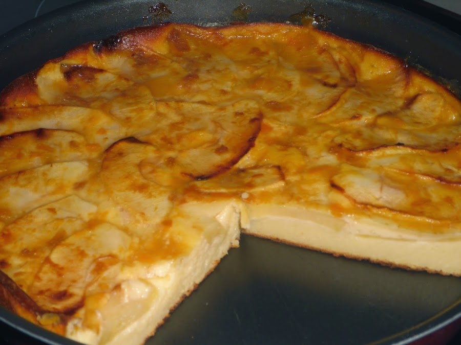 Echamos en un recipiente 4 huevos ,4 manzanas peladas y troceadas .Añadimos un vaso de azúcar y continuación la harina. Le añadimos un vaso de leche y trituramos muy bien todo.