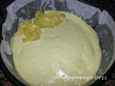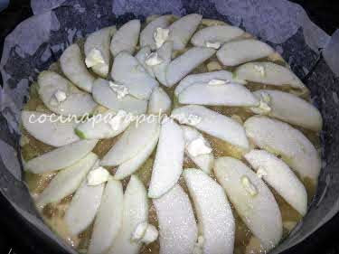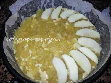 En un molde engrasado vertemos la masa y sobre ella el puré de manzanas; cortamos en láminas las dos manzanas reservadas y colocamos encima del puré.