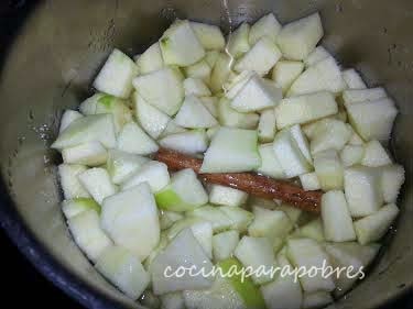 Pelamos las manzanas, reservando dos, y las cocemos cortadas a trozos con el vaso de vino. 5 cucharadas de azúcar y la canela; una vez cocidas se reducen a puré y se reservan.