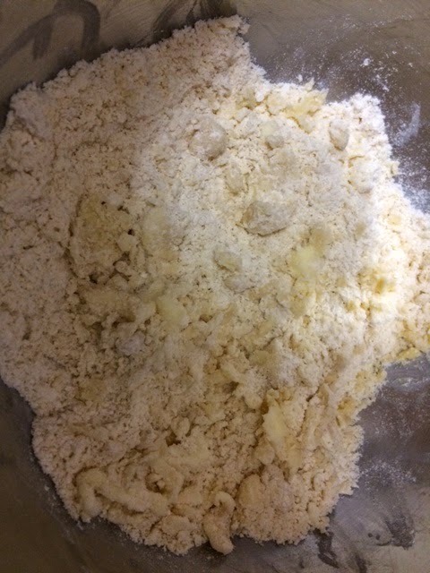 En un bol mezclamos los 200 grs de harina, la cucharadita de azúcar y la 1/2 cucharadita de sal y después añadimos la mantequilla cortada en dados y mezclamos sin calentar con las manos excesivamente para que la mantequilla no se derrita.