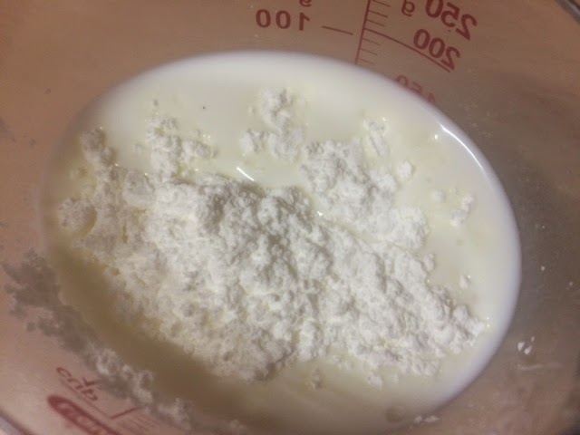 Para ello, ponemos un 100 ml de leche entera de los 500 ml que necesitamos en un vaso y diluimos la maicena.
