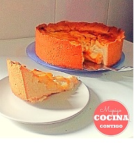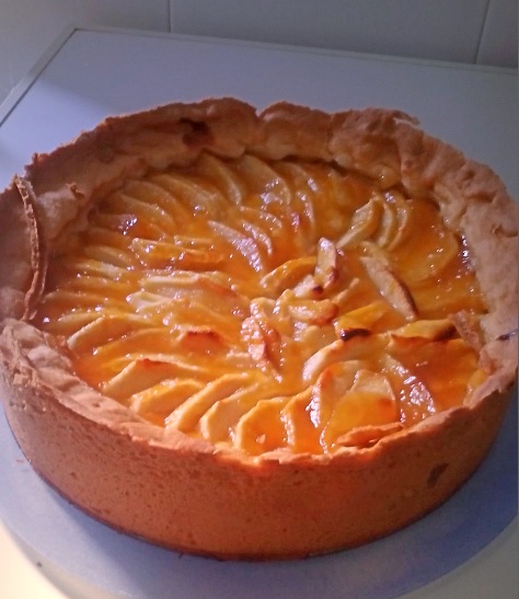 Hemos precalentado el horno previamente. En el molde dónde anteriormente hemos colocado la masa, añadimos la crema y cortamos trozos de manzana para cubrirla por encima. Untamos toda la superficie de la tarta con el almíbar, quedará dorada y brillante.