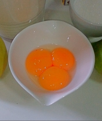 Lo primero que vamos a hacer es separar las yemas de las claras, esto requiere un poco de maña, pero es fácil. Cascamos el huevo y vamos pasando la yema de un lado al otro de la cáscara dejando que la clara caiga en un recipiente. Reservamos las yemas en un cuenco.