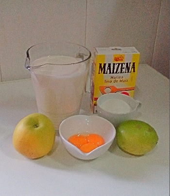 Ponemos en un cazo al fuego la leche y el azúcar. Rallamos una manzana pelada y la añadimos al cazo. Por otro lado en un vaso ponemos un poco de leche fría y disolvemos la maicena en ella, esto es para que la crema espese, y añadimos esta mezcla al cazo dónde tenemos la leche. Por otra parte, cuando la leche este templada (que no caliente, no queremos cuajar las yemas) añadimos un poco en el cuenco dónde hemos reservado las yemas y removemos, luego también las añadimos al cazo.