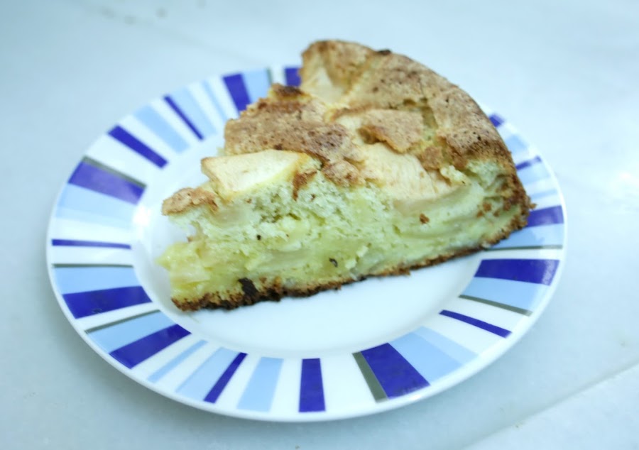 Pelamos las manzanas y cortamos 2 de ellas a daditos y las vamos añadiendo a la mezcla de las yemas, azúcar, agua y harina.