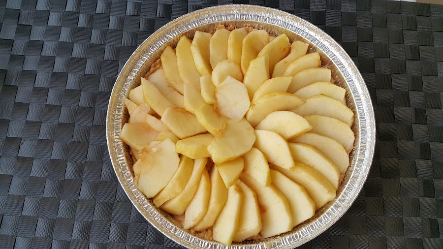Precalentamos el horno a 170ºC. Mientras cortamos las 2 manzanas, previamente peladas, a gajos y los ponemos sobre la tarta.