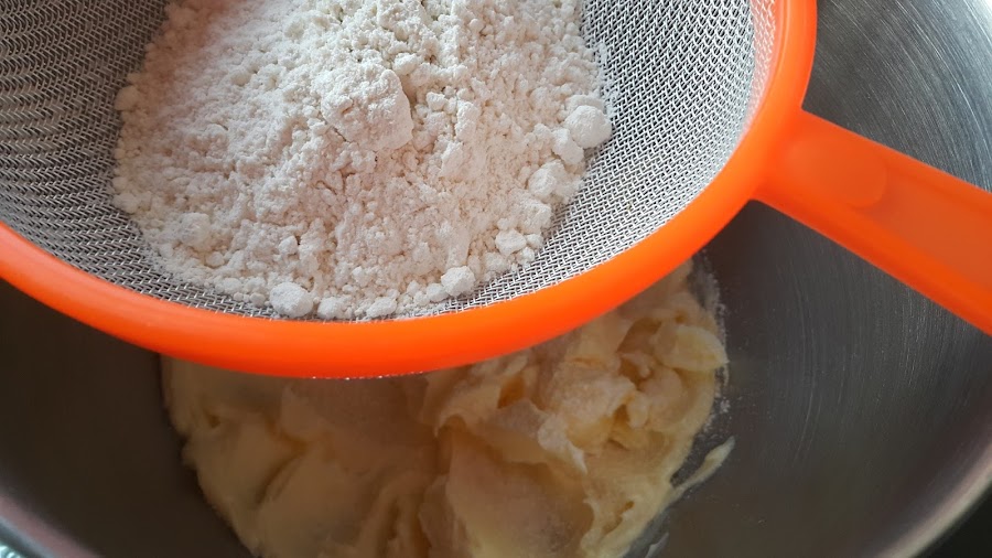 Ponemos la mantequilla en pomada en una batidora y batimos unos minutos. Seguidamente tamizamos la harina.