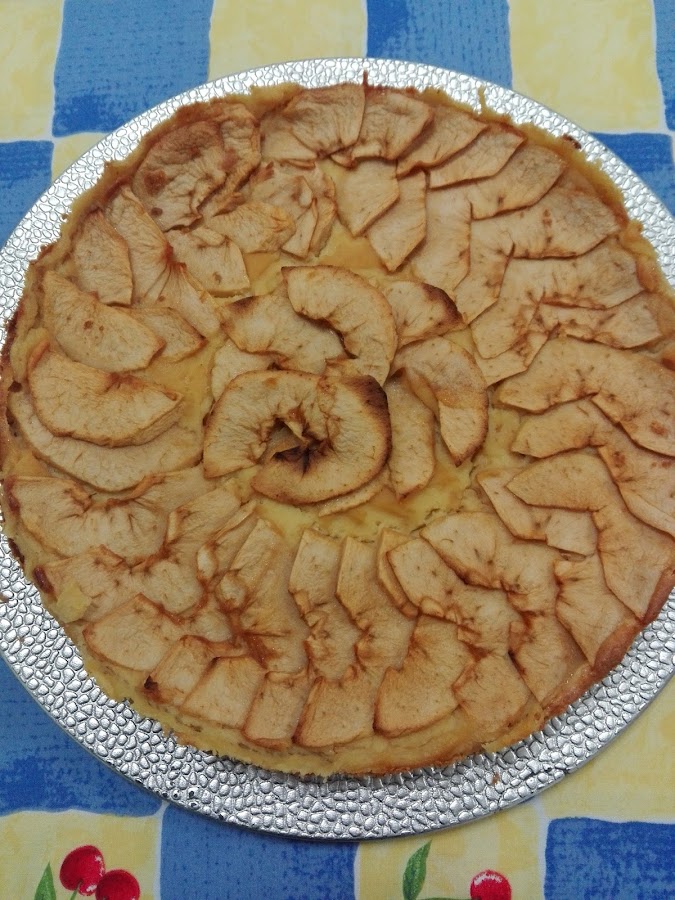 Pelamos y cortamos las manzanas en finas láminas y las colocamos en orden de forma circular tapando toda la superficie de la crema.