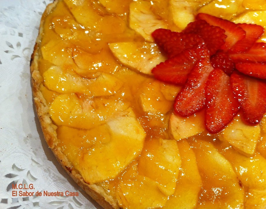 Saca, deja enfriar un poco y úntala con mermelada de melocotón o albaricoque. Decora con un fresón laminado en forma de flor.