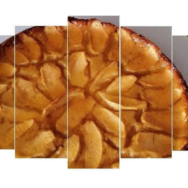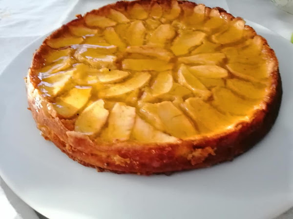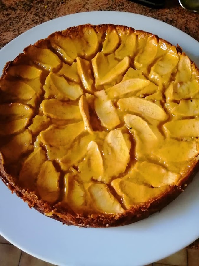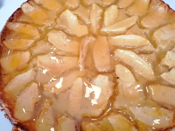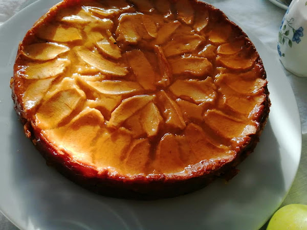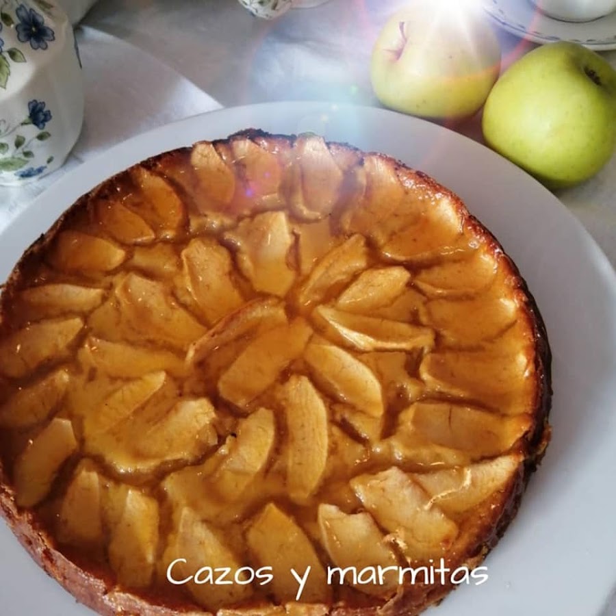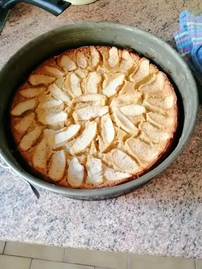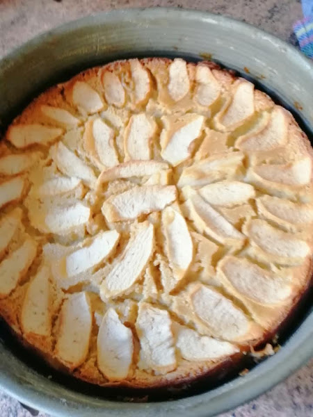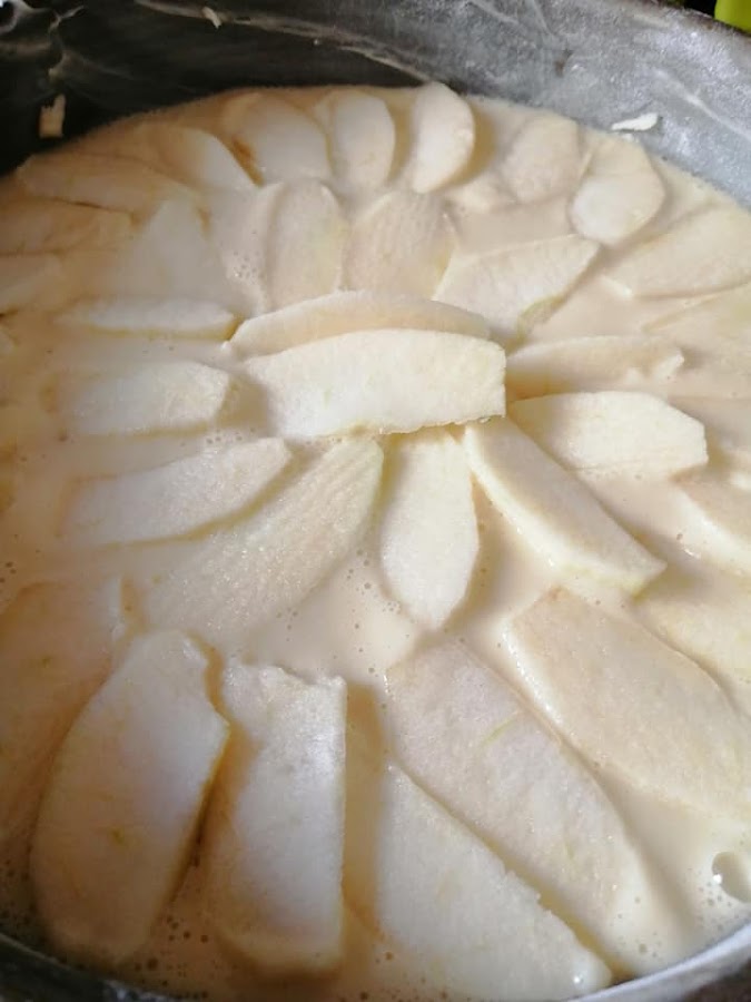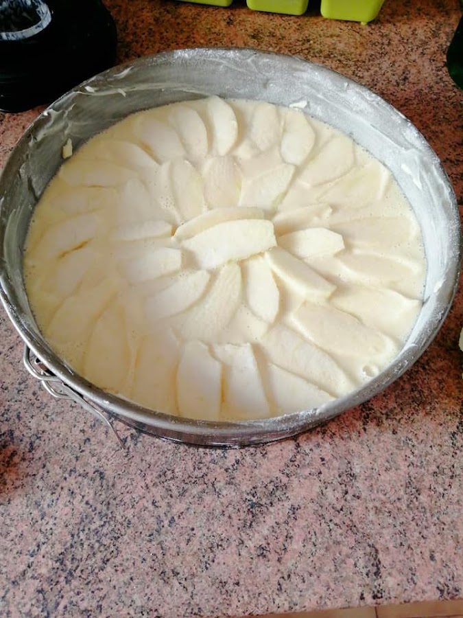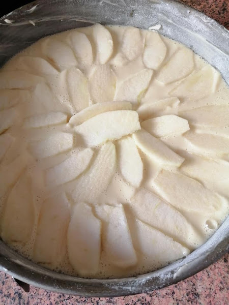 5- Seguidamente las colocamos en círculo sobre la mezcla hasta cubrir toda la superficie de la tarta, así tendrá ese aspecto tan característico que tienen las tartas de manzana, y una vez lista la llevamos al horno precalentado a 180°C durante 1h. aprox., estará hecha cuando al pincharla con un palito salga limpio o ligeramente húmedo.