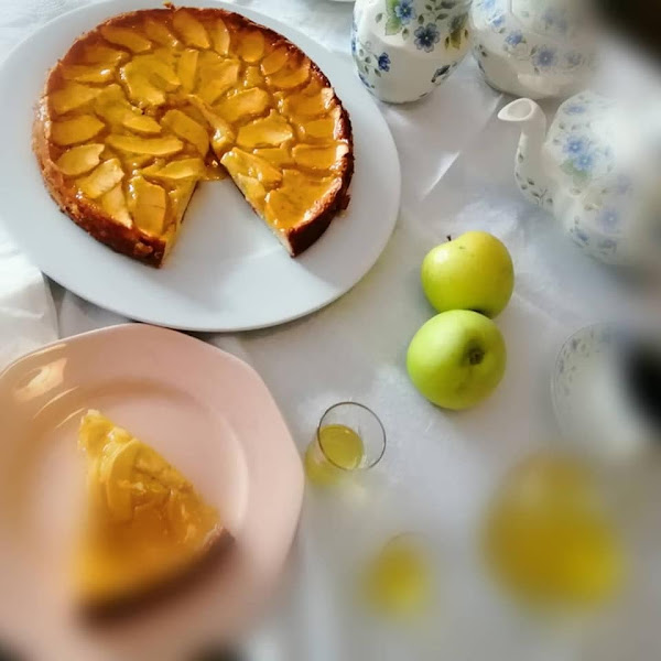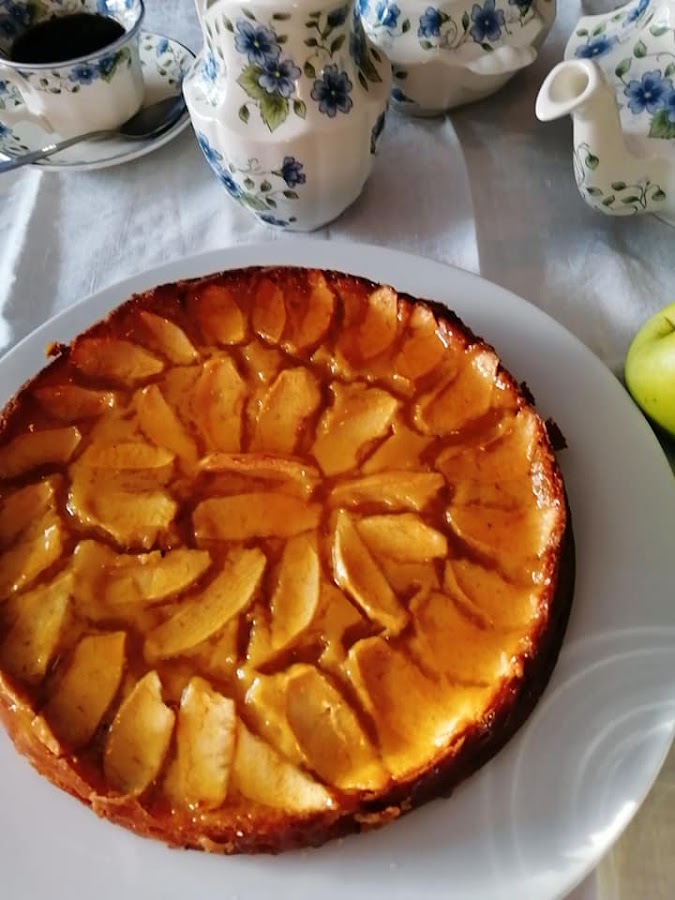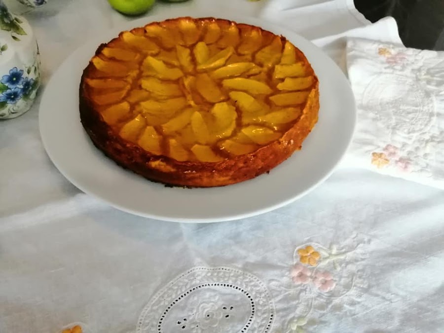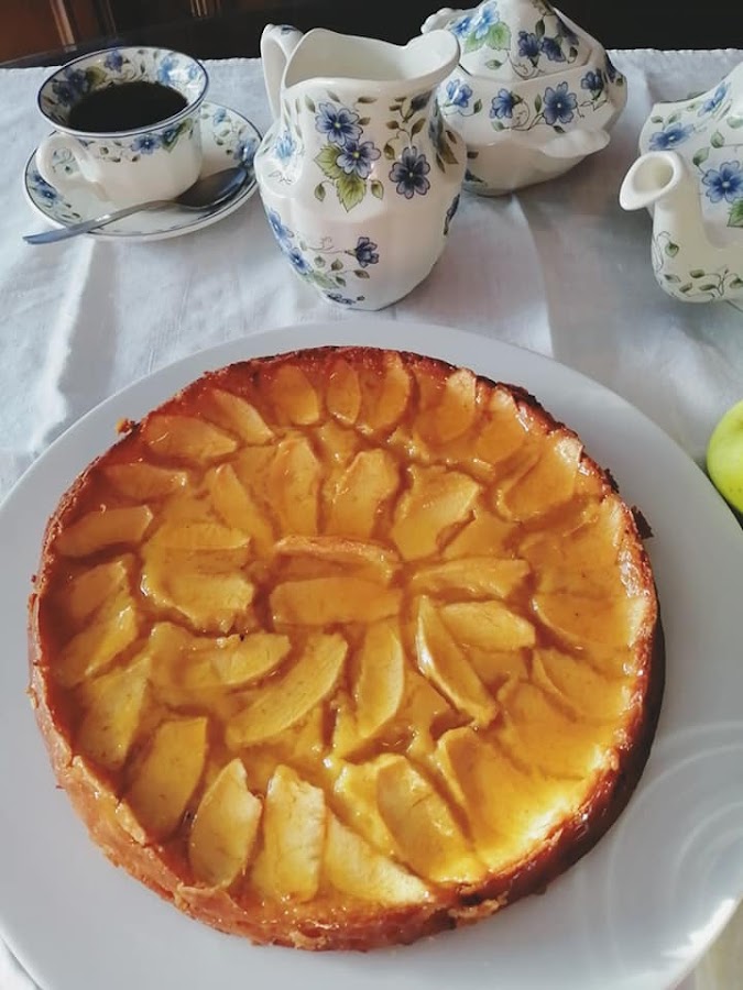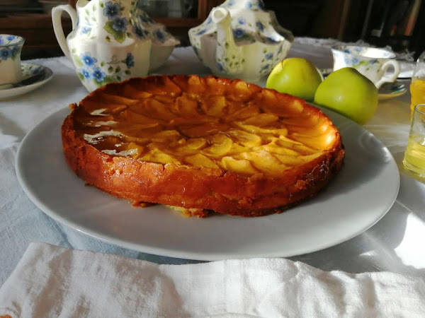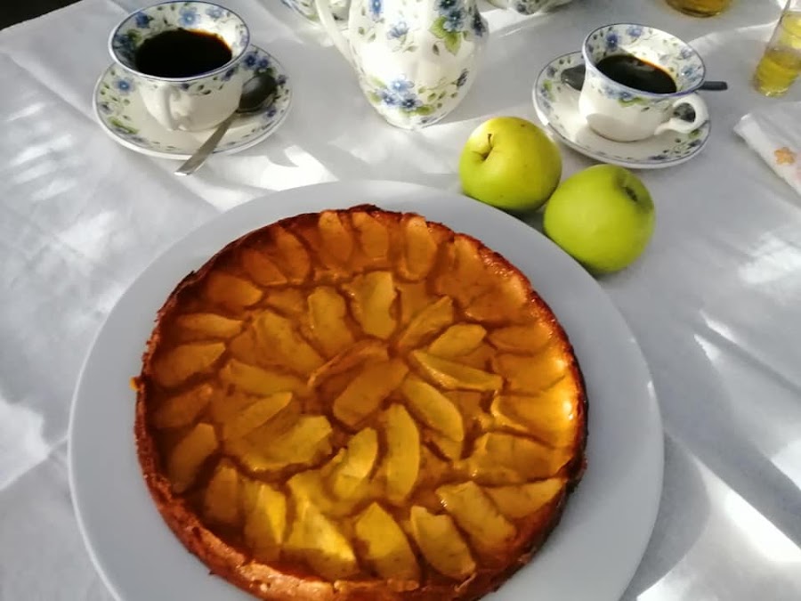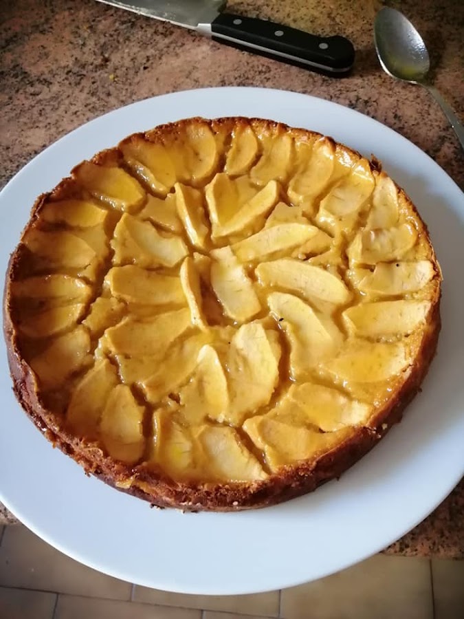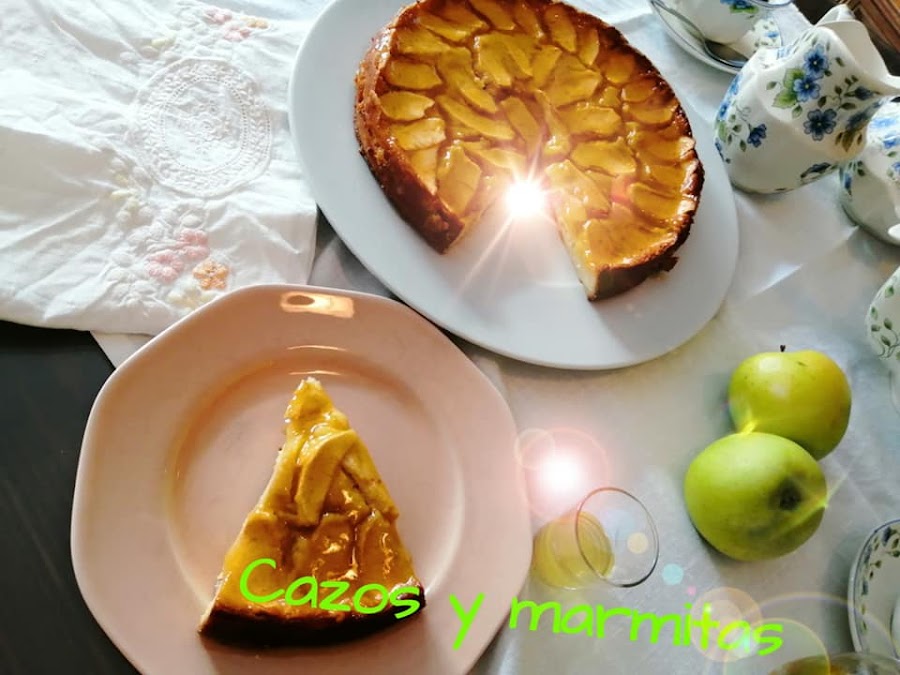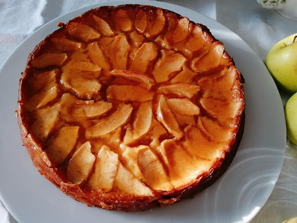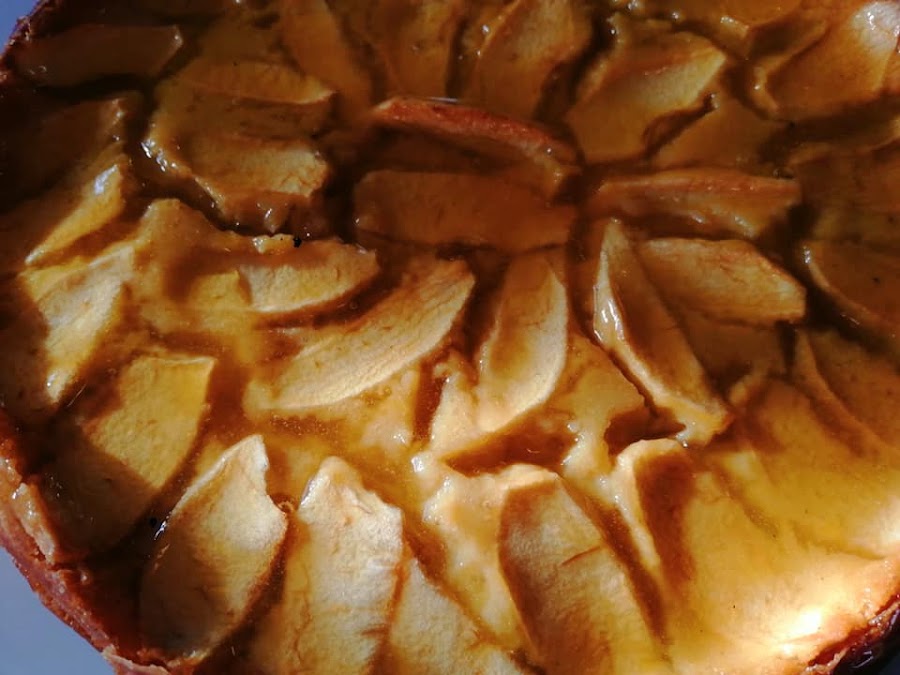 5- Seguidamente las colocamos en círculo sobre la mezcla hasta cubrir toda la superficie de la tarta, así tendrá ese aspecto tan característico que tienen las tartas de manzana, y una vez lista la llevamos al horno precalentado a 180°C durante 1h. aprox., estará hecha cuando al pincharla con un palito salga limpio o ligeramente húmedo.