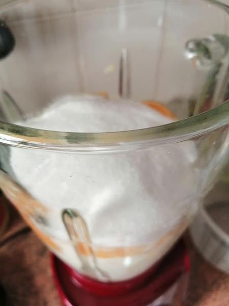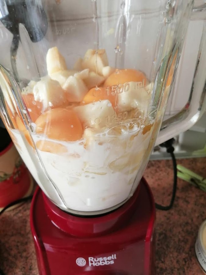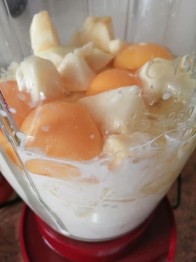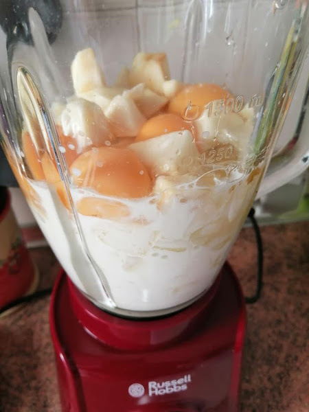 2- Ahora las ponemos en un bol junto con el azúcar, los huevos y la leche y con una batidora eléctrica lo trituramos todo muy bien.
