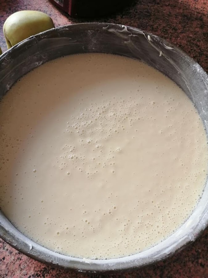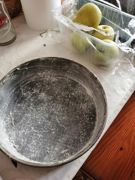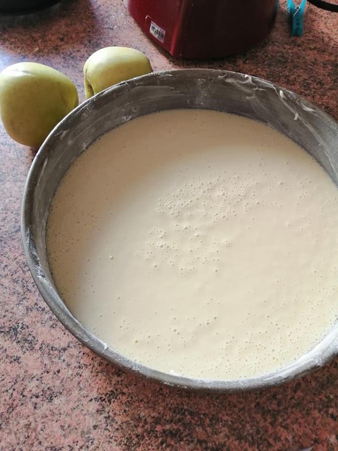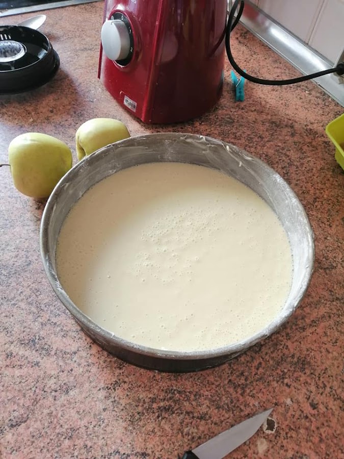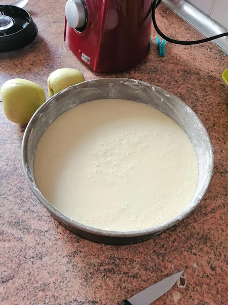 4- Una vez lista vertemos la mezcla en un molde desmontable de 25cm de diámetro al que hemos puesto mantequilla y harina para facilitar el desmoldado y a continuación cogemos las 2 manzanas que nos quedan, les quitamos el corazón, las pelamos y las cortamos en láminas.