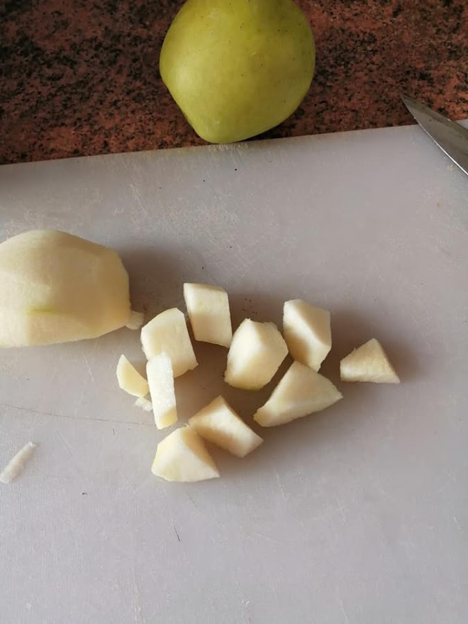 1- Para empezar cogemos 4 de las 6 manzanas y las lavamos, las pelamos, les quitamos el corazón y las troceamos.