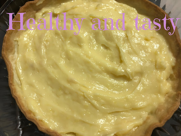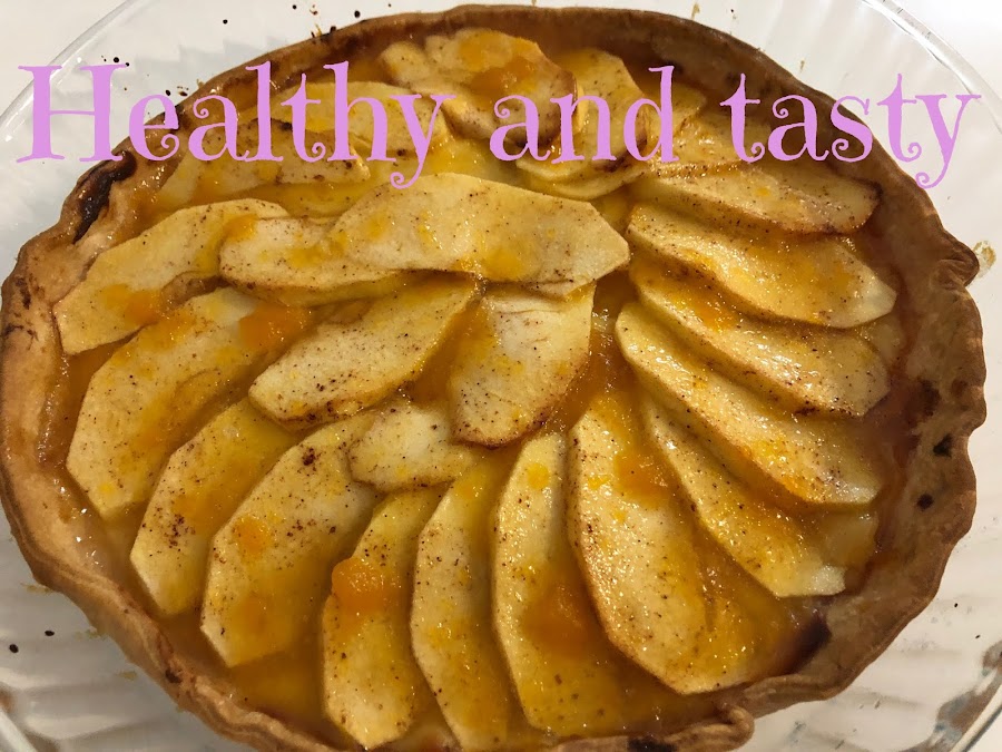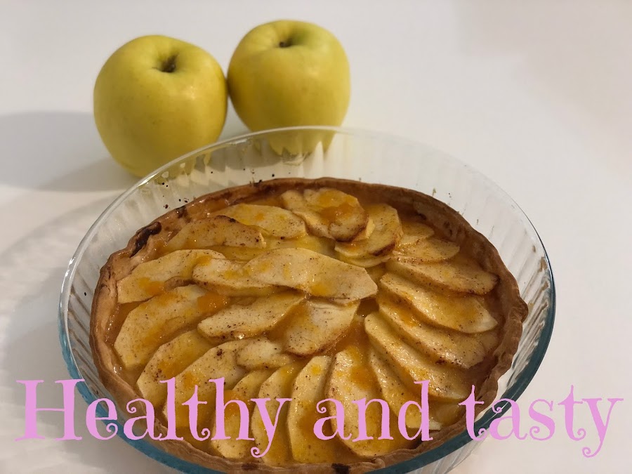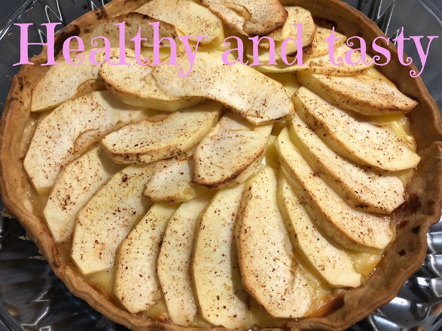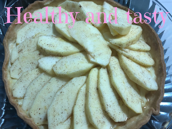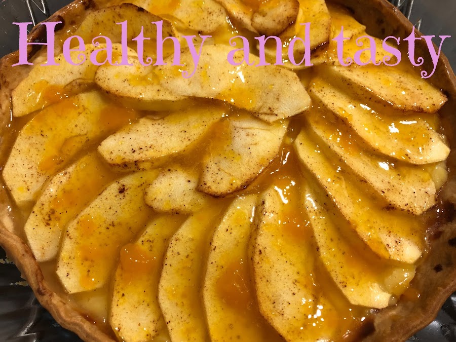 Ponemos la crema pastelera encima de la base medio horneada, cubrimos con la manzana en forma circular. Pincelamos la manzana con la mezcla de limón, azúcar y canela.