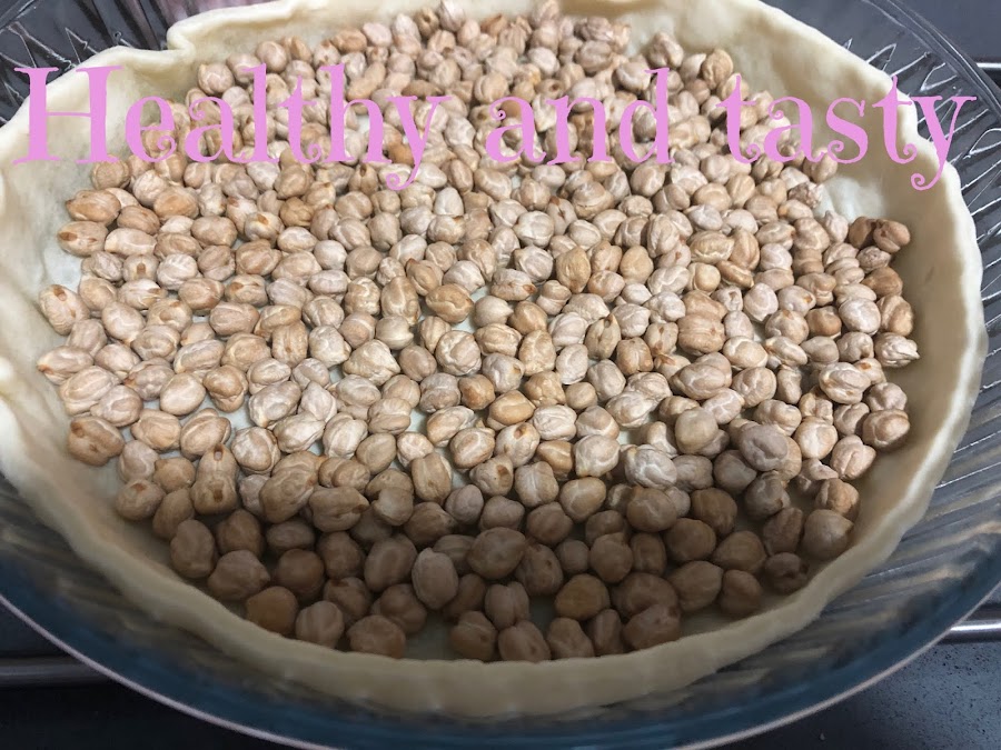 Ponemos la masa brisa y la pinchamos con un tenedor para que no suba. La horneamos con calor arriba y abajo durante 5 minutos. Ponemos garbanzos crudos encima para evitar que suba la masa y horneamos 10 minutos más. Reservamos.