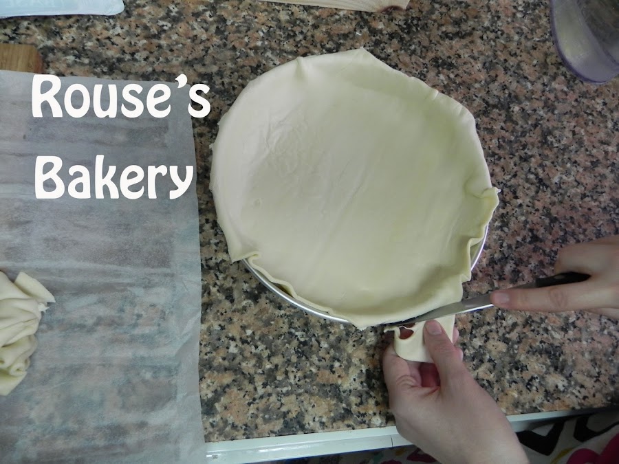 Retiramos el exceso de hojaldre, dejando las paredes altas para que no se salga el relleno, pinchamos la base de la tarta con un tenedor y con el mismo papel vegetal que trae el hojaldre lo colocamos encima y ponemos peso (yo uso garbanzos) para evitar que suba.
