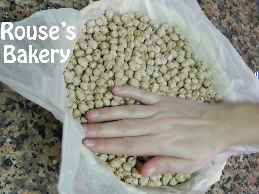 Distribuimos bien el peso y metemos al horno durante 10 minutos. Lo sacamos pasado este tiempo, retiramos los garbanzos y el papel y metemos al horno 3 minutos más al horno. Cuidado! vigilándolo por si empieza a hincharse, si se hincha antes de los tres minutos lo sacamos aunque no haya pasado este tiempo.