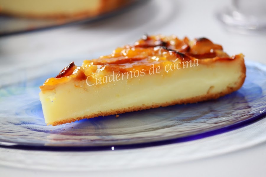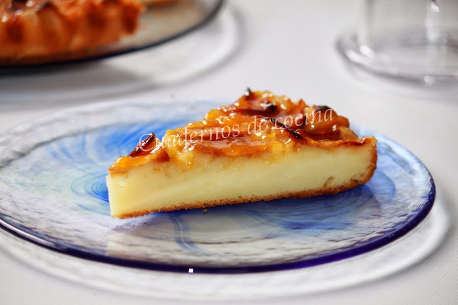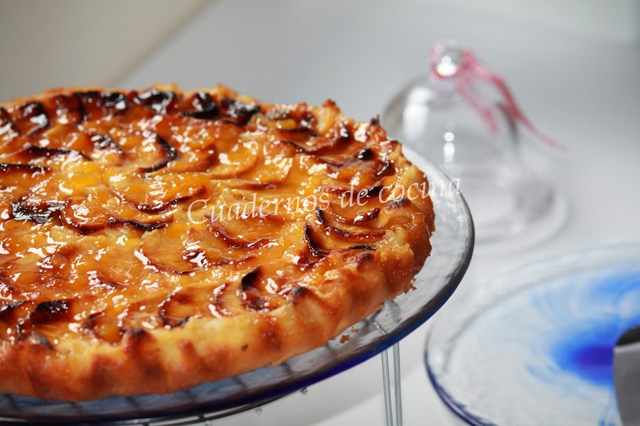 Cuando esté cuajada la tarta, la sacamos del horno y la untamos con el almíbar de melocotón. La volvemos a meter en el horno unos minutos para que se gratine.