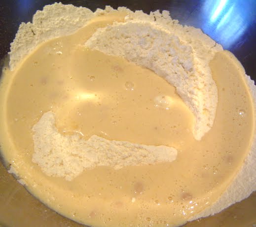 Añadimos a la mezcla de harina el huevo batido, la leche y el aceite.