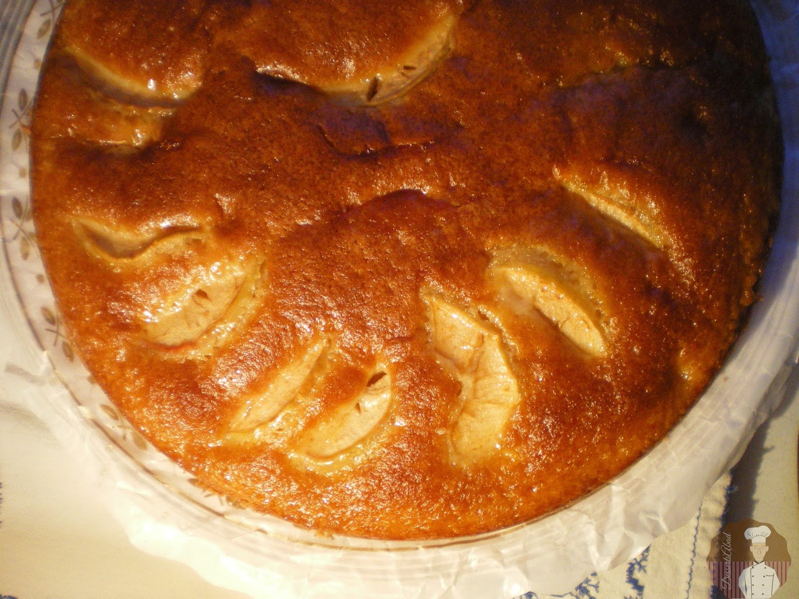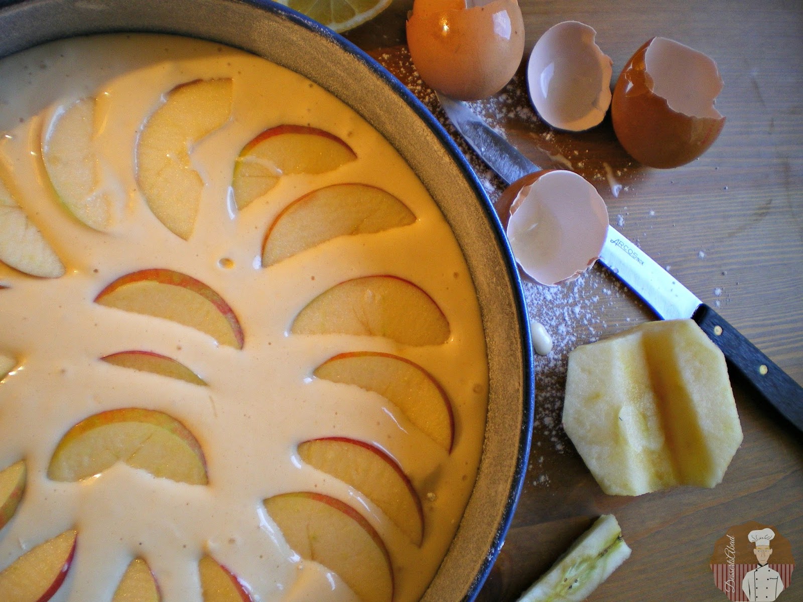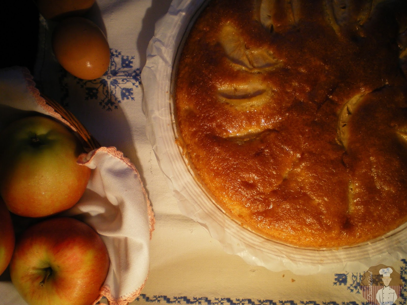 En un paréntesis de la merienda, mi mujer maliciosamente me había pasado por whatsapp la imagen de su porción de tarta, así que no podía dejar pasar esta oportunidad de hacerme con la receta de esa delicatesen que tantas veces me mencionó que había disfrutado desde pequeña. Doña Cristina se prestó enseguida a dictarle la receta a Sol, una fórmula en la que los ingredientes básicos que todos tenemos en nuestras cocinas, eran la esencia de una tarta que yo presagiaba iba a ser más complicada y que resultó se la mar de sencillita de preparar, "de las de toda la vida" pero con un sabor y aroma sorprendentes además, gracias al almíbar que la "emborracha", una vez horneada adquiere una texura muy jugosa que la hace irresistible, y con algunas similitudes al pastel de manzanas al estilo de Suabia que ya hice en cierta ocasión y que podéis consultar en el enlace.