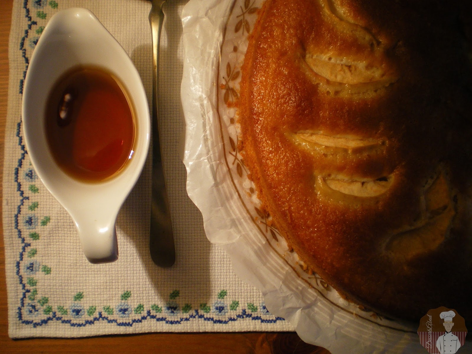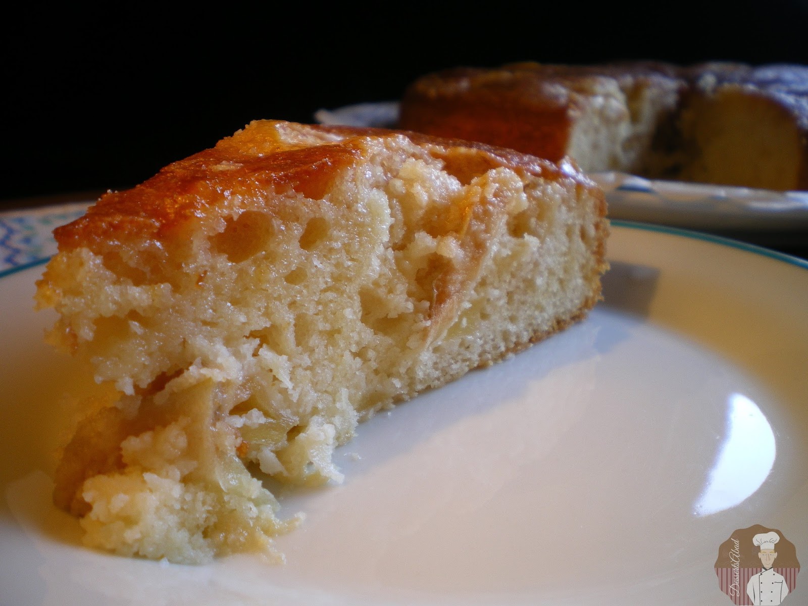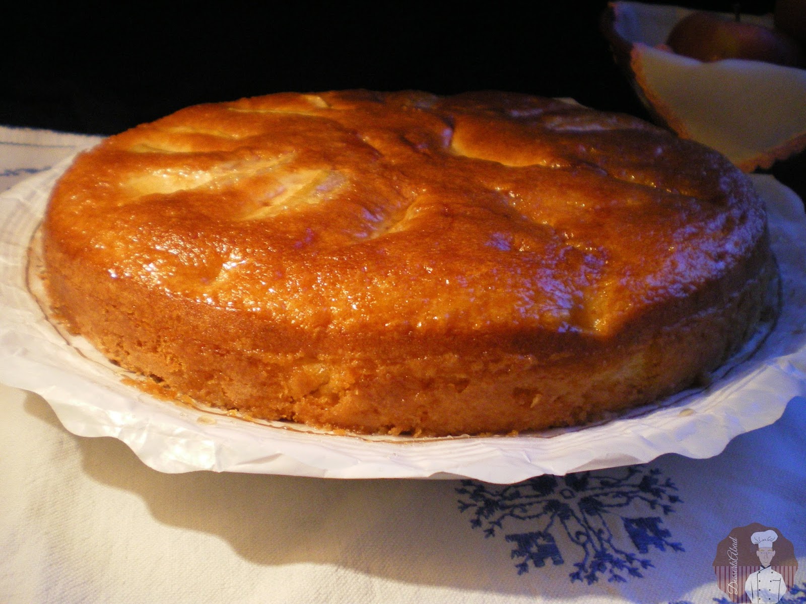 En un paréntesis de la merienda, mi mujer maliciosamente me había pasado por whatsapp la imagen de su porción de tarta, así que no podía dejar pasar esta oportunidad de hacerme con la receta de esa delicatesen que tantas veces me mencionó que había disfrutado desde pequeña. Doña Cristina se prestó enseguida a dictarle la receta a Sol, una fórmula en la que los ingredientes básicos que todos tenemos en nuestras cocinas, eran la esencia de una tarta que yo presagiaba iba a ser más complicada y que resultó se la mar de sencillita de preparar, "de las de toda la vida" pero con un sabor y aroma sorprendentes además, gracias al almíbar que la "emborracha", una vez horneada adquiere una texura muy jugosa que la hace irresistible, y con algunas similitudes al pastel de manzanas al estilo de Suabia que ya hice en cierta ocasión y que podéis consultar en el enlace.
