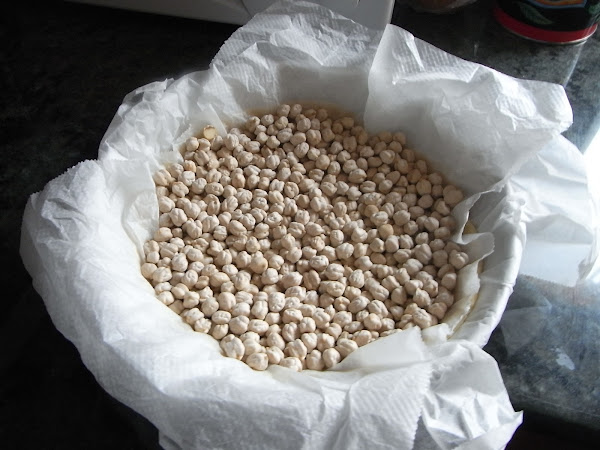 Cuando la saquemos del horno cogemos el papel con los garbanzos y los retiramos.