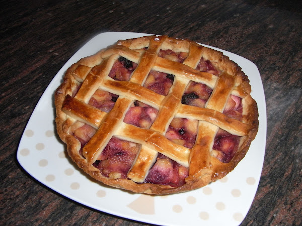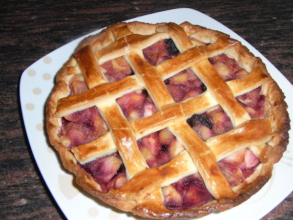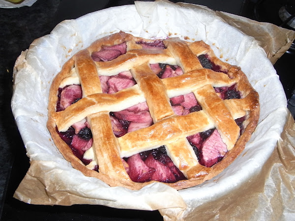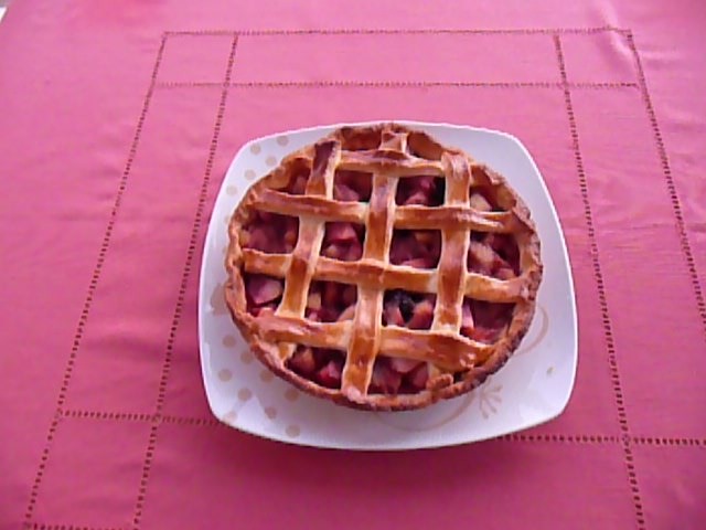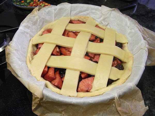 Cortamos unas tiras y colocamos la fruta en el molde bien repartida y colocamos 3 tiras paralelas, levantamos de una punta la del centro y ponemos una perpendicular, la bajamos y levantamos las otras dos, ponemos otra al través y bajamos las 2 que habíamos levantado, levantamos la primera y colocamos otra y así formamos el enrejado con las tiras. Apretamos las puntas de las tiras a la masa para sellarla y cortamos el sobrante.