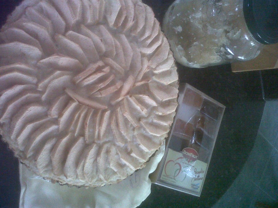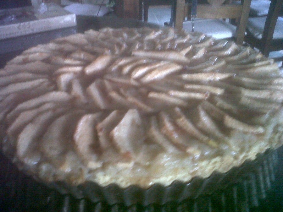 Se rellena la masa con esta crema compuesta, se decora con las manzanas peladas y cortadas en láminas finas, haciendo una floren el centro.