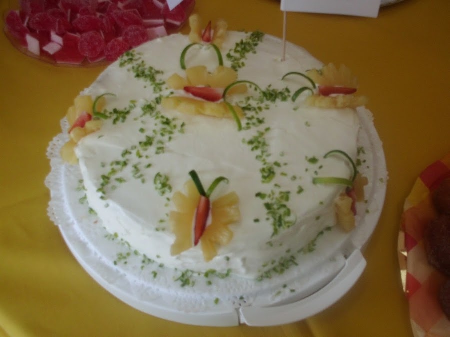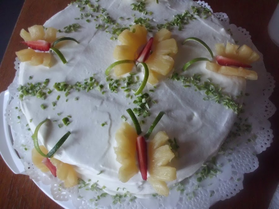 Se pone la piña, las fresas y la lima sobre la tarta en forma de mariposas: la piña para las alas, las fresas para el cuerpo y la lima para las antenas.