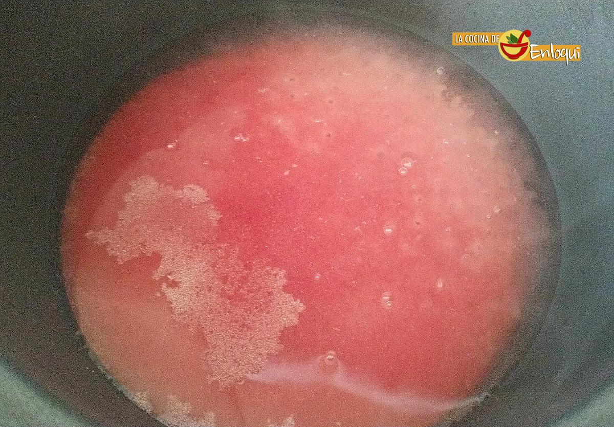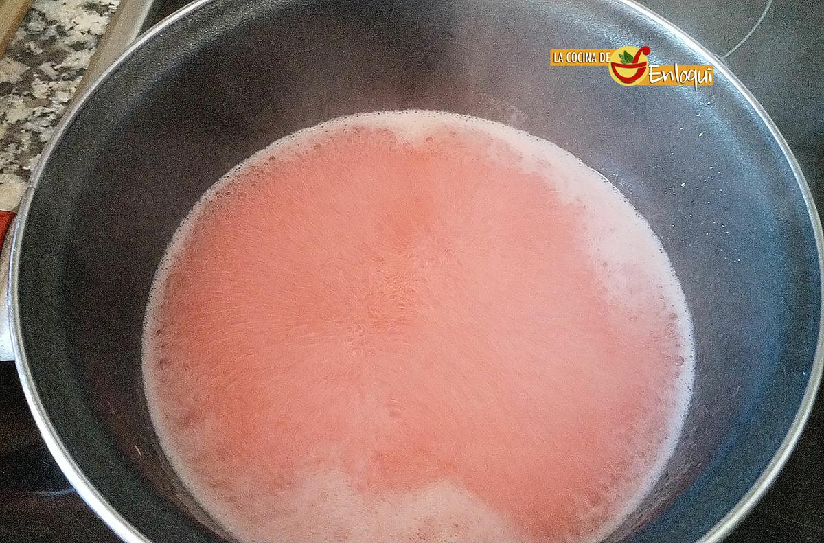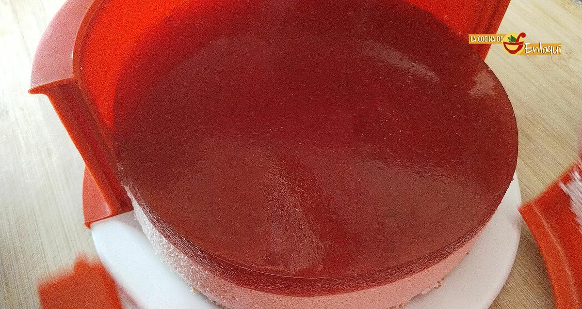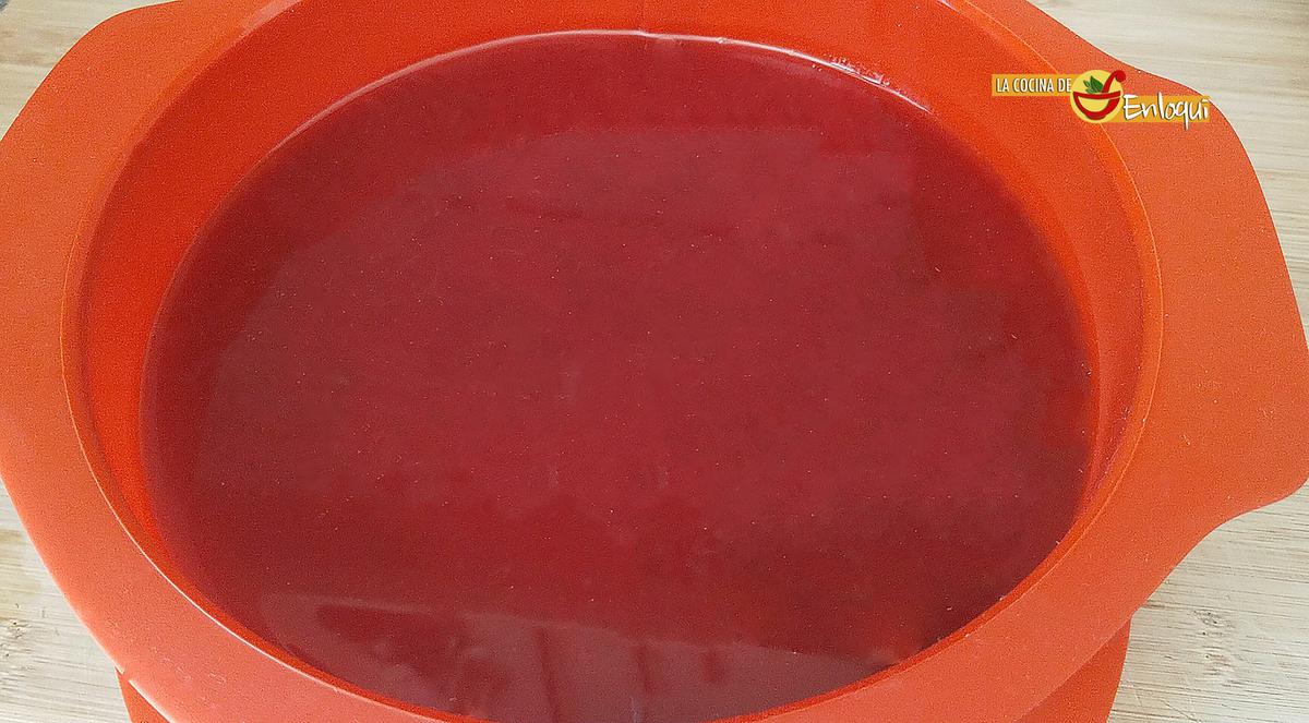 Por último tendrás que preparar la capa superior de la tarta o cobertura. Consiste en una capa de gelatina de mermelada de fresa con la que quedará muy vistosa.Para ello pon un cazo al fuego con el agua y añade el contenido de un sobre de gelatina de fresa. Remueve hasta que rompa a hervir, entonces retira del fuego y deja templar a temperatura ambiente.