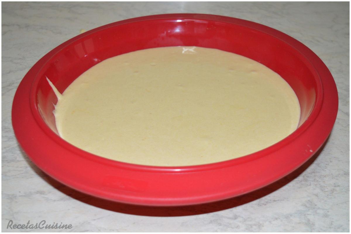 4. Vertemos la mezcla en un molde de 25cm de diámetro. Si el molde no es antiadherente, lo engrasaremos con un pelín de mantequilla. Metemos en el horno y cocemos durante 45 minutos.