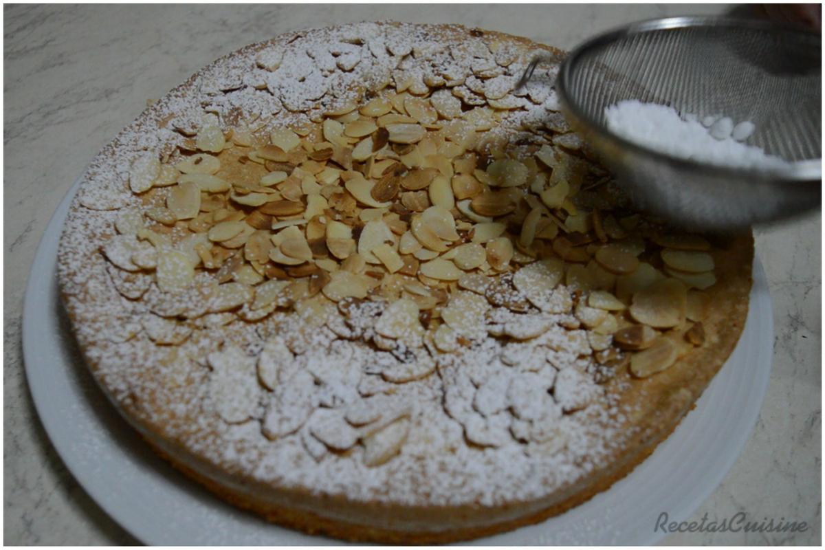 8. Cubrimos la superficie de la tarta con las almendras y espolvoreamos generosamente con azúcar glass. Podemos hacerlo a través de un colador, para que caiga fino.