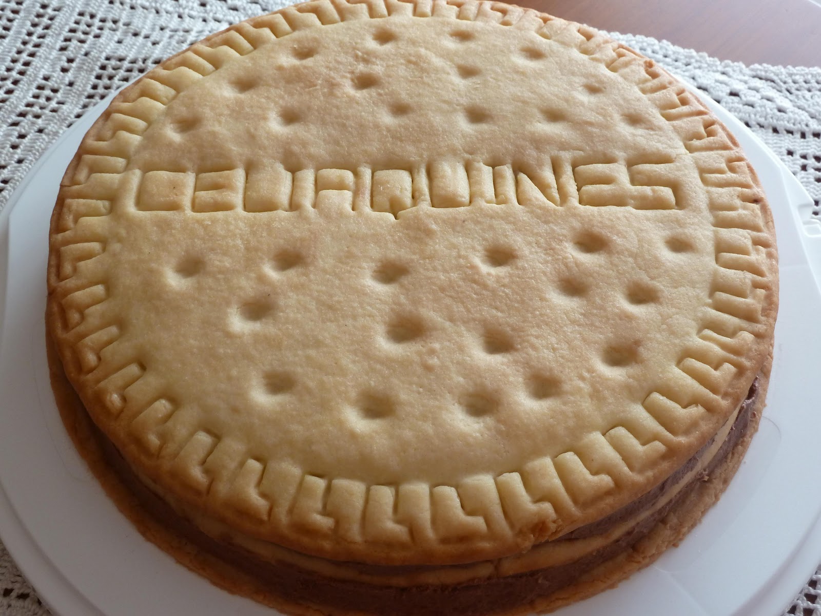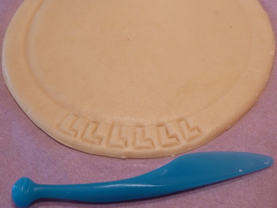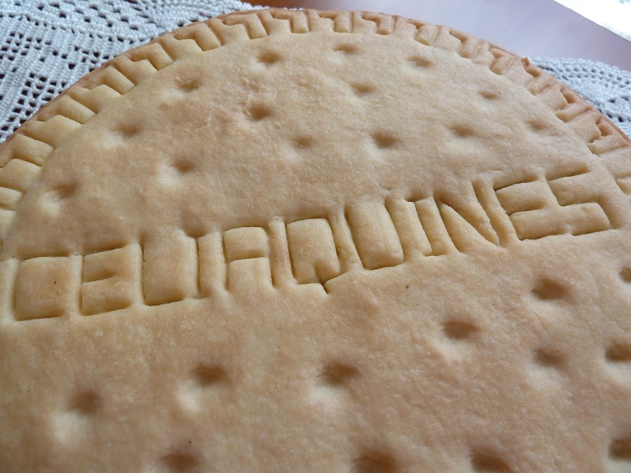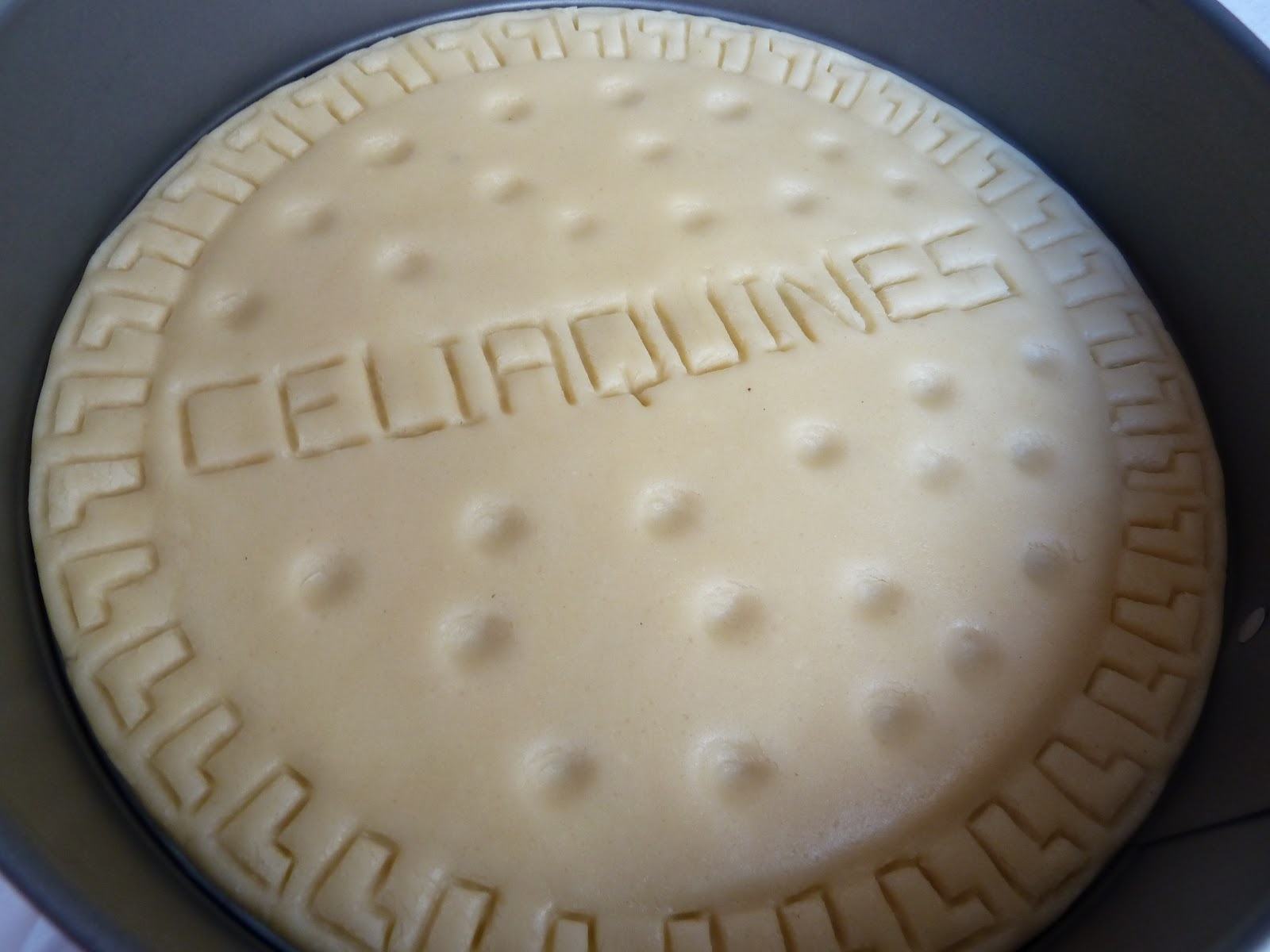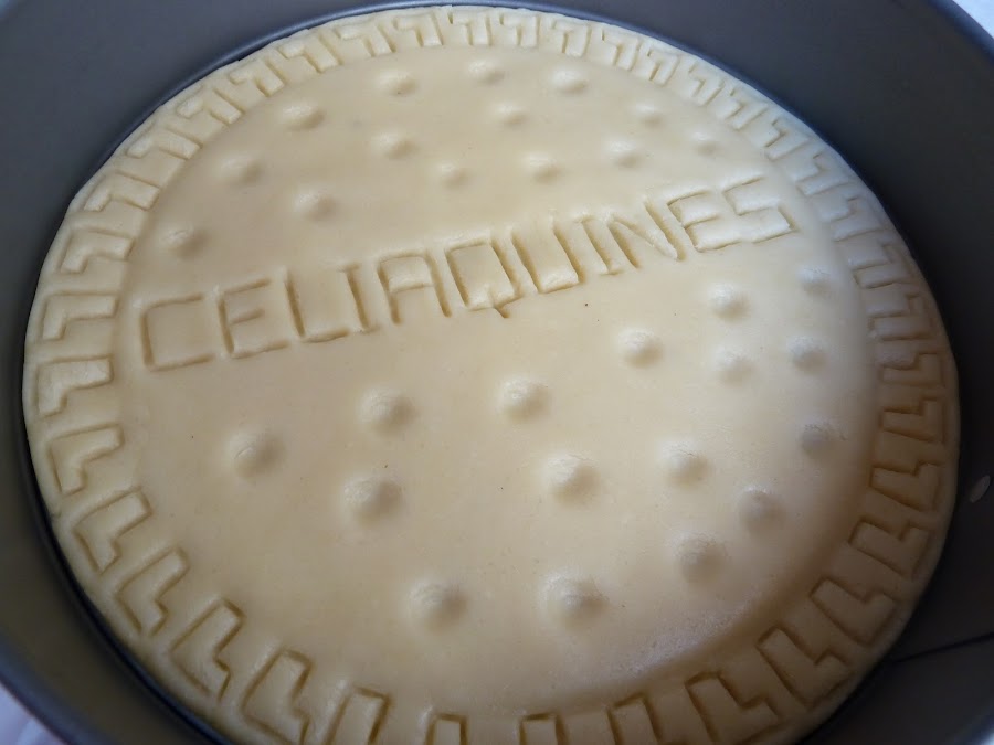 9) Hacer los dibujos de la galleta. Yo he utilizado un cuchillo de plástico de Ikea y he dibujado unas "L" por todo el contorno. He escrito "CELIAQUINES" en vez de la palabra "MARÍA" que viene en las clásicas galletas. Y he hecho pequeñas hendiduras sobre la superficie clavando la yema del dedo meñique.