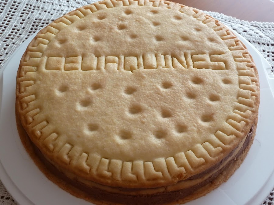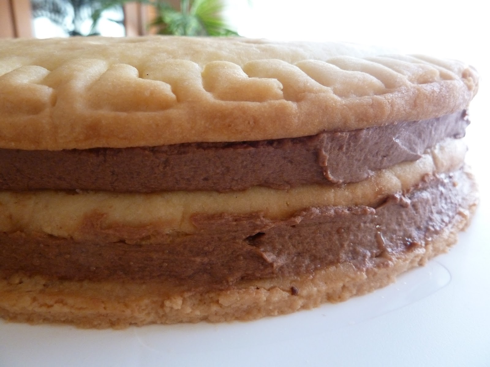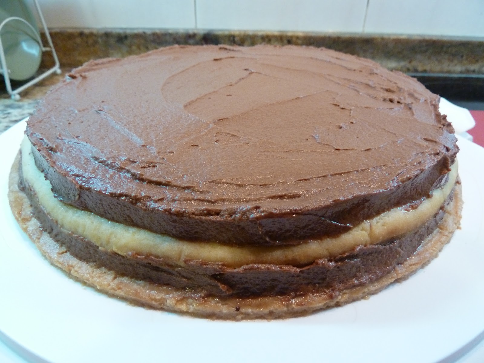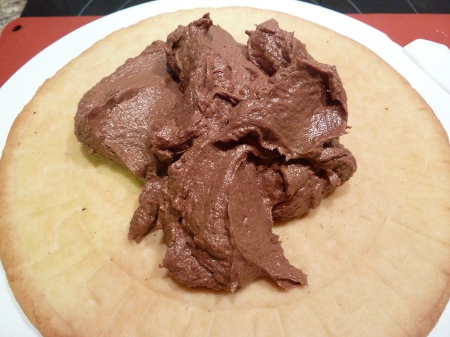 2) Poner la mitad de la crema de chocolate (la mitad son unos 450-500g) sobre la superficie de la galleta, y extenderla bien antes de colocar la siguiente.
