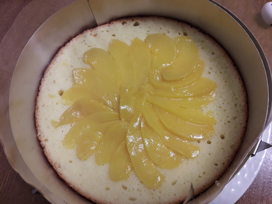 Cortamos en gajos los melocotones y colocamos la mitad, sobre el bizcocho.