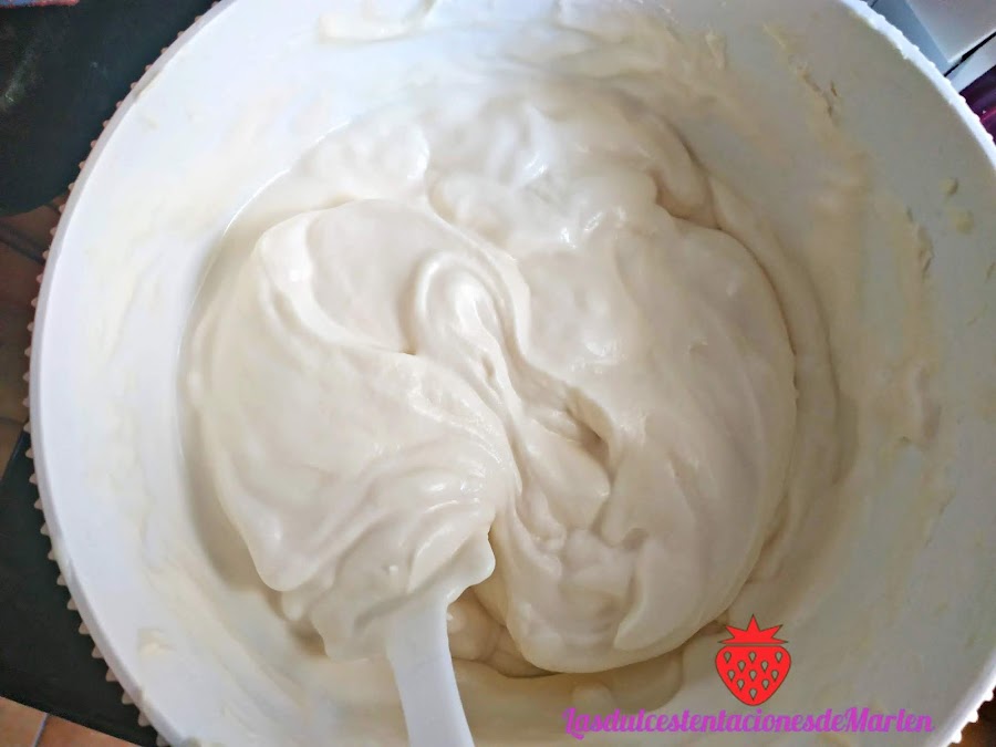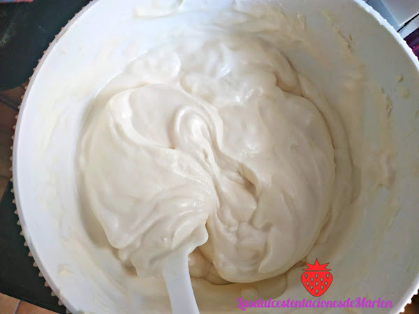 Mientras tanto montar la nata (crema de leche) con el azúcar, el queso crema y la esencia de coco. Todo poquito a poco.
