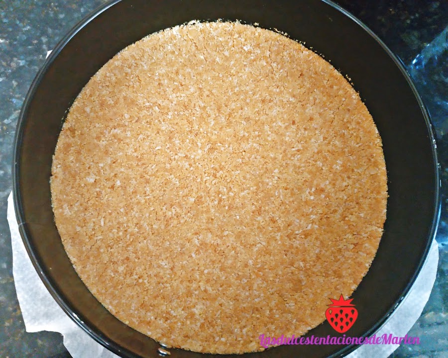 Disponer sobre la base del molde , previamente forrada con papel vegetal.Yo he forrado el interior del molde con acetato ( papel transparente) , pero se puede forrar también con papel vegetal ( de horno). Con una cuchara o con un vaso ir apretando la mezcla de galletas, procurando que quede bien nivelada por toda la superficie del molde.
