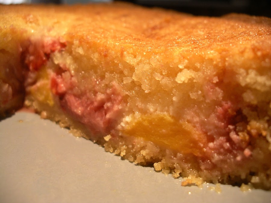 Cuando la base este lista, la sacamos del horno y distribuimos la fruta por encima y después cubrimos con la mezcla que tenemos en el bol y con la ayuda de una espátula o cuchara. Hornear durante 1 hora a 180 ºC o hasta que cuaje.