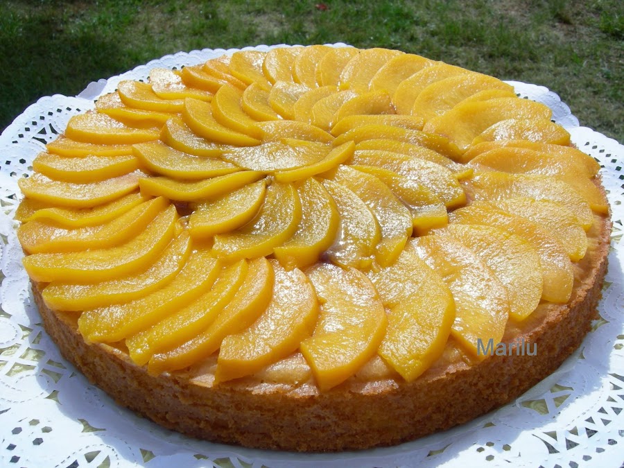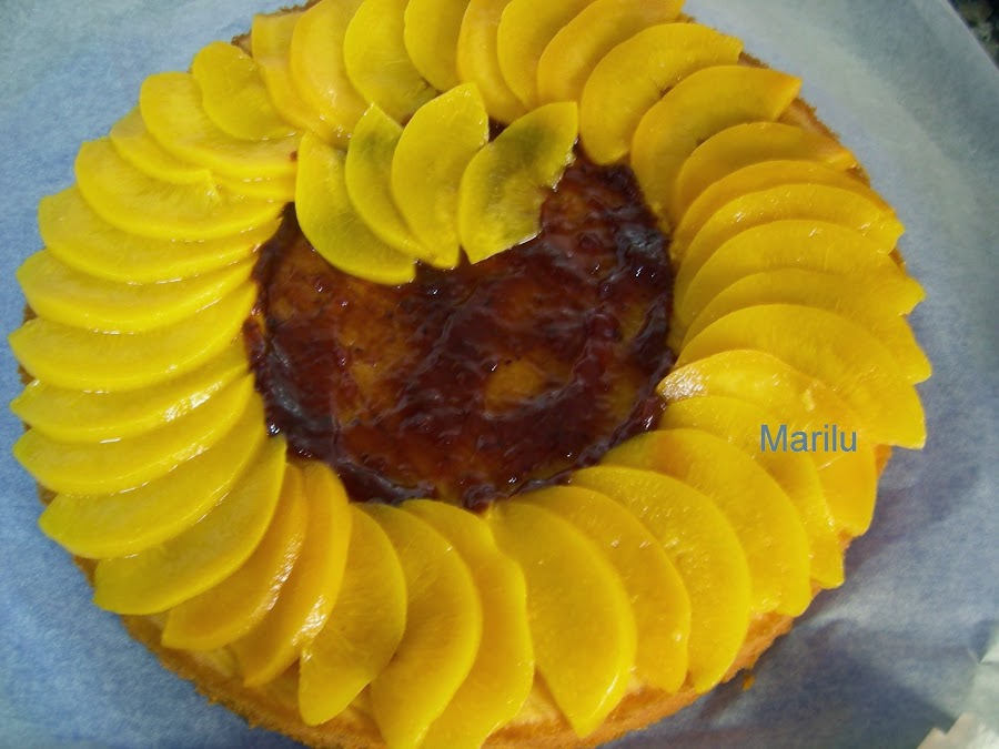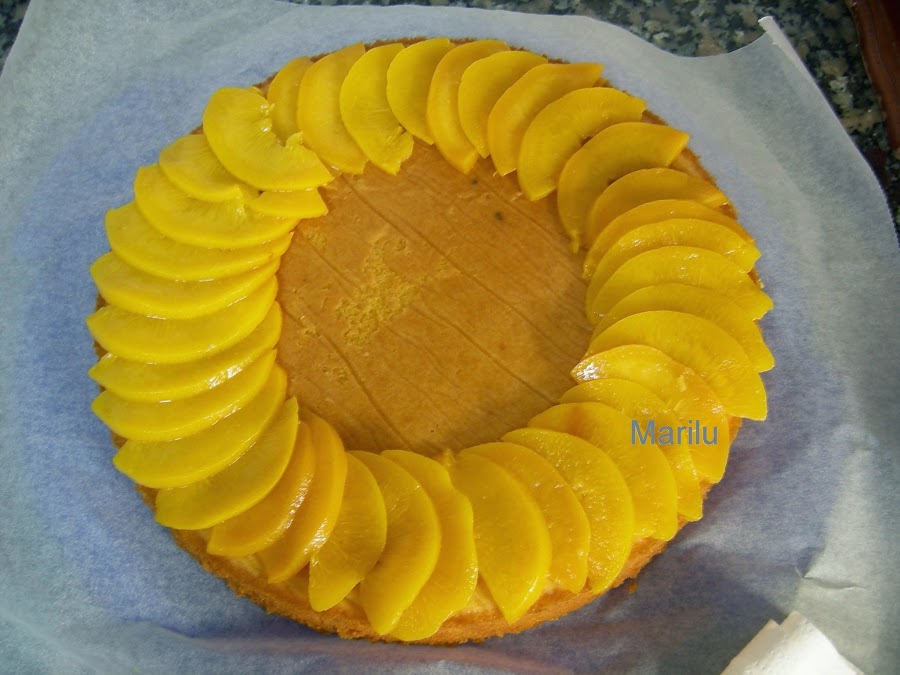 Cortamos los melocotones del segundo bote en láminas finas y vamos cubriendo la superficie de nuestra tarta, dejando un hueco en el centro.