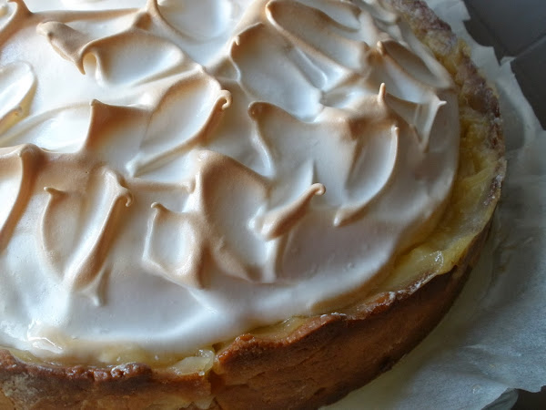 Ahora montamos la tarta; ponemos la masa horneada en un molde para el horno, dentro vertemos la crema de limón. Extendemos con cuidado el merengue sobre la crema hasta llegar a los bordes de la masa.