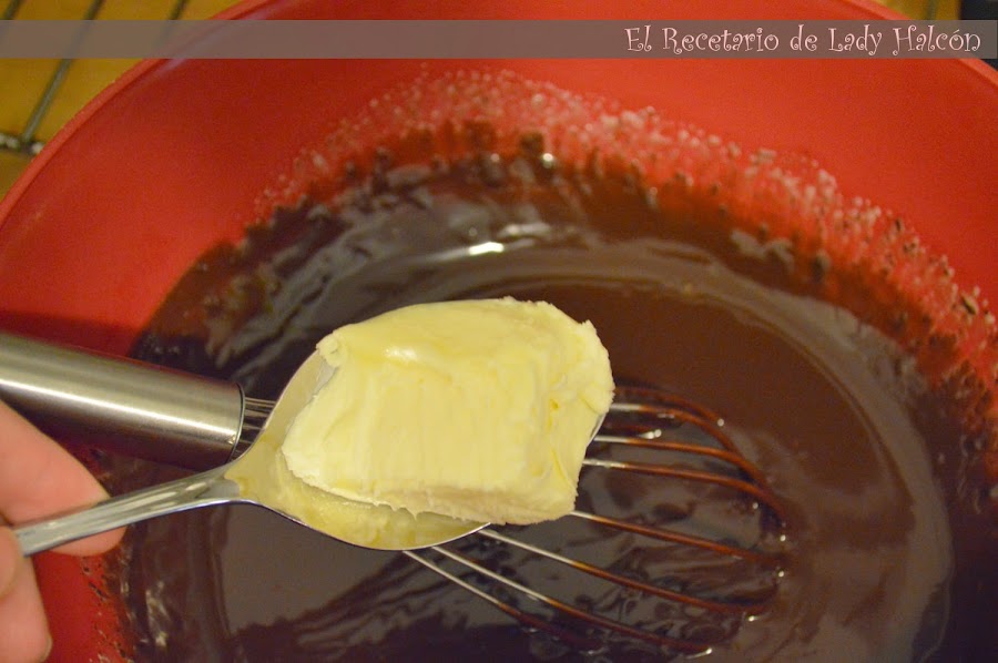 Cuando el chocolate se haya deshecho por completo y esté todo bien mezclado, añade la mantequilla y remueve hasta que se deshaga.