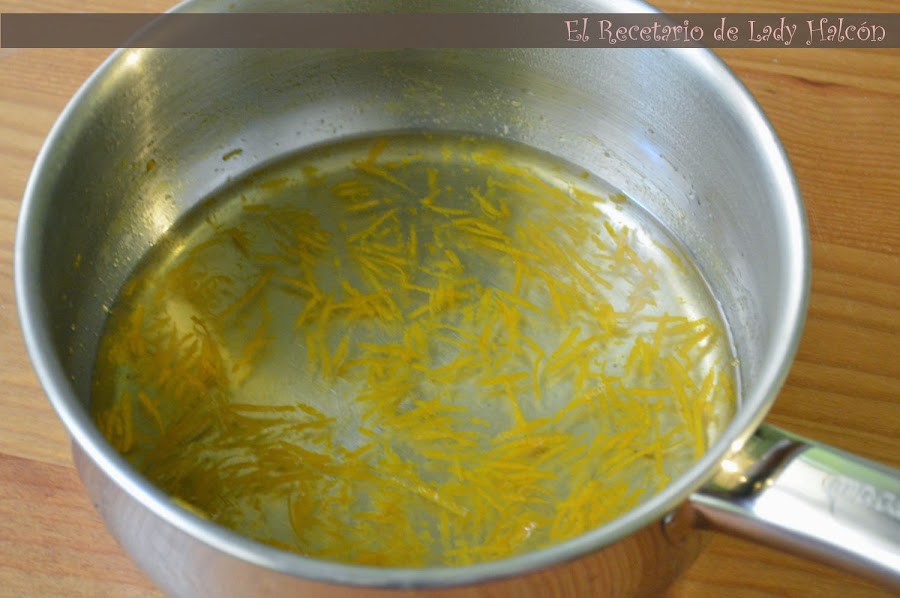En un cazo a fuego lento coloca el agua y el azúcar. Deja que hierva hasta que el azúcar se disuelva, añade la ralladura de media naranja, déjalo un par de minutos mientras remueves y retíralo del fuego.
