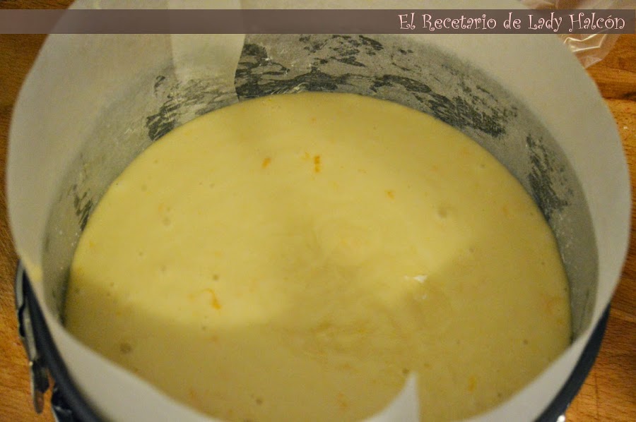 Engrasa todos los lados del molde con mantequilla, espolvorea un poco de harina hasta que quede todo cubierto y añade la masa en el molde. Yo cubrí los laterales con papel de hornear para que quedara más liso.