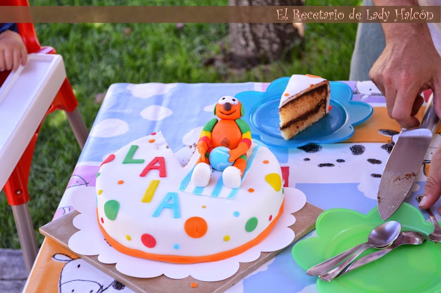 Investigué por internet quien era este personaje infantil y, como lo vi tan gracioso, decidí que él tenía que ser el protagonista de la tarta acompañado de un montón de colores. El resultado gustó mucho a todos, pero sobre todo a la cumpleañera, que se lanzó a la tarta en cuanto la vio jeje, aunque todos estuvimos de acuerdo en que mi versión fue el MIC cincuentón, por que me salió con algún kilillo de más jajaja.