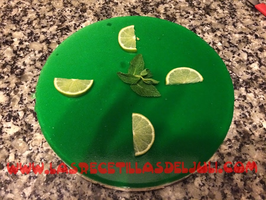 5. Una vez cuajada la tarta preparamos la cobertura. Para ello separamos un poco de mojito y añadimos la gelatina, removiendo bien. Calentamos el resto de mojito con una cucharada de azúcar y cuando esté caliente añadimos el resto con la gelatina. Removemos bien, añadimos la gota de colorante verde y dejamos enfriar. Cuando esté fría decoramos la tarta con unas rodajas de lima y unas hojas de hierbabuena y cubrimos con la gelatina.