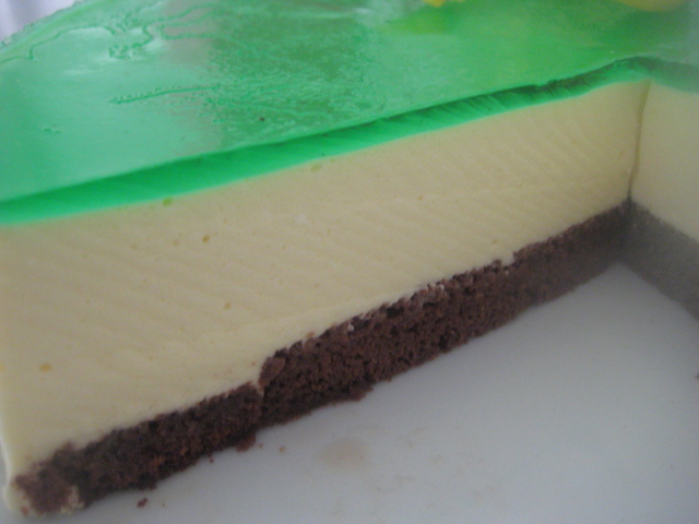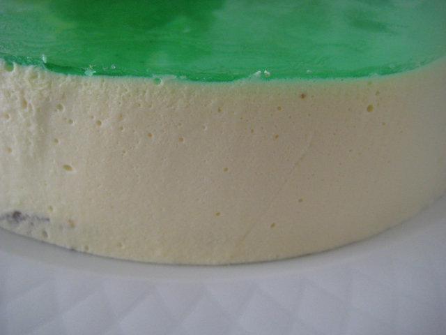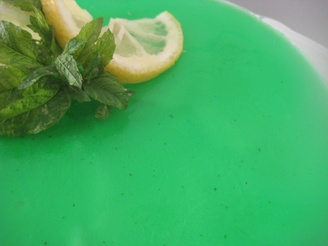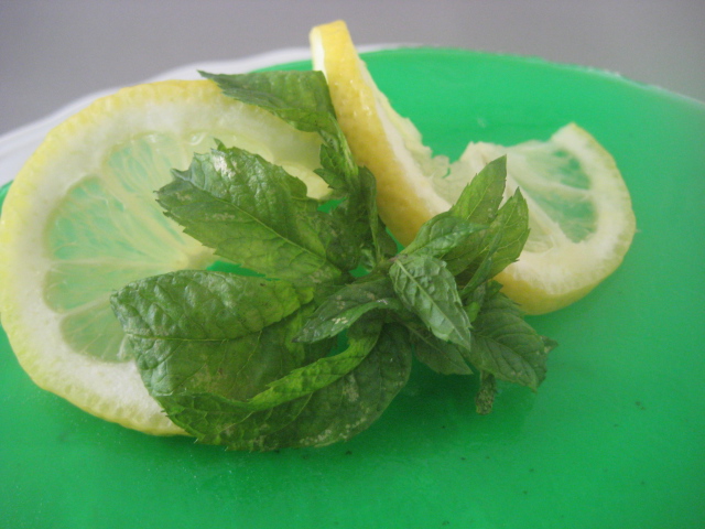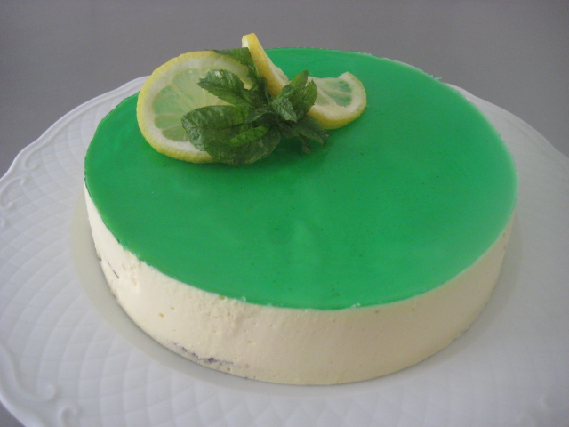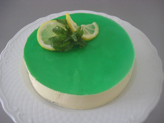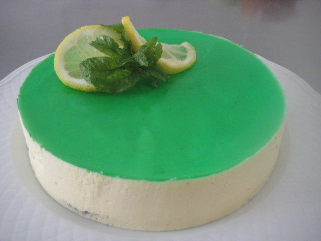 Para preparar el glaseado: Hidratar en agua fría las dos hojas de gelatina indicadas. Calentar el agua con el azúcar y cuando esté bien caliente añadir las hojas de gelatina. Mezclar con el zumo de limón y con el ponche de ron reservado. Añadir un poco de colorante verde y verter sobre la tarta ya cuajada. A la hora de ponerlo, el glaseado debe estar casi frío. De lo contrario nos estropeará la tarta y verterlo desde muy abajo sobre el dorso de una cuchara. Dejar reposar en la nevera durante una hora o dos y a la hora de servir desmoldar la tarta. Yo me suelo ayudar con un soplete para que los bordes queden bien limpios y sin destrozos de cuchillo. Adornar con limón y unas horas de hierbabuena y lista para chuparse los dedos