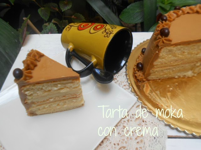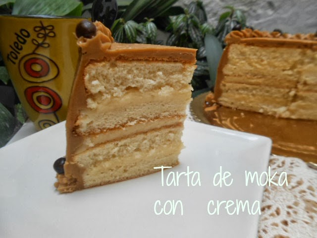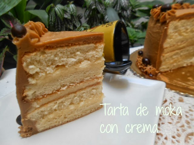 Hacemos tres partes con la crema y vamos poniendo un disco de bizcocho y relleno hasta montar la tarta.